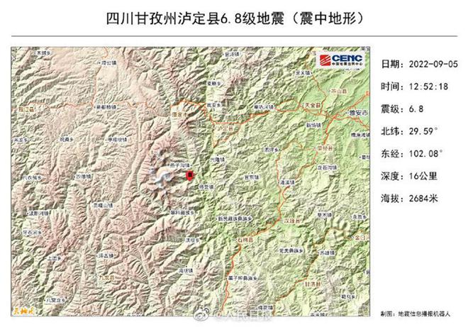 据中国地震台网正式测定,9月5日12时52分在四川甘孜州泸定县(北纬29.59度,东经102.08度)发生6.8级地震,震源深度16千米。