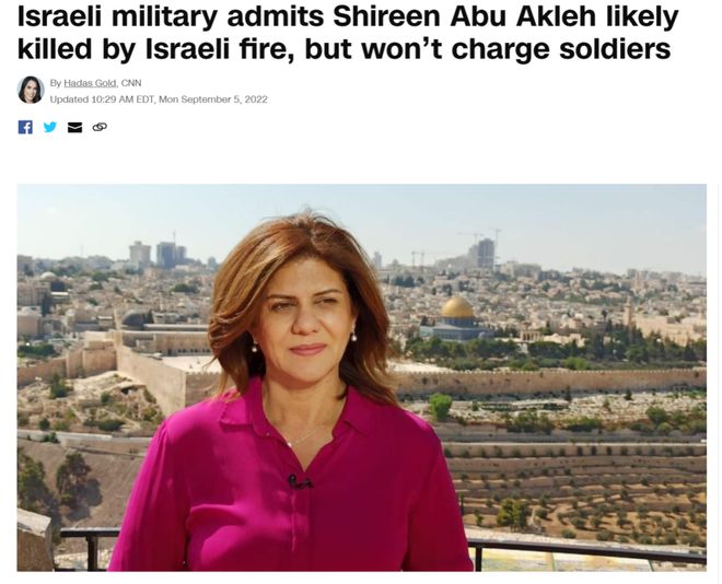 据美国有线电视新闻网(CNN)最新消息,当地时间星期一,以色列首次承认,巴勒斯坦裔美国女希琳·阿布·阿格莱“很有可能”是被以色列士兵开枪打死的。