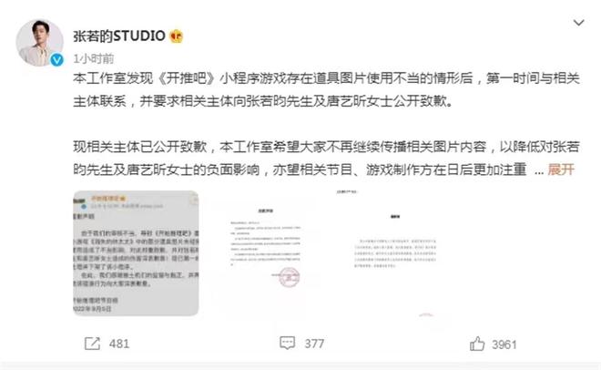在网友提出疑问后不久,节目《开始推理吧》、制作方“侦侦日上”制作人何小盒子和制作公司火游工作室相继发布致歉声明,称误用张若昀和唐艺昕照片做参考是因为审核不当,现已对小程序游戏进行下架处理并做内部整改。