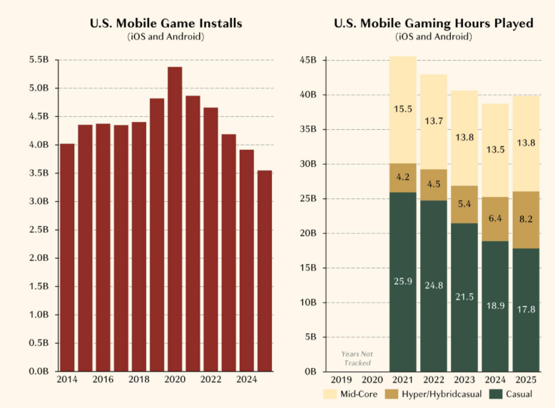 与此同时,全美游戏类应用的装机量创下12年以来的新低;玩家时长也远低于2021年的高峰。