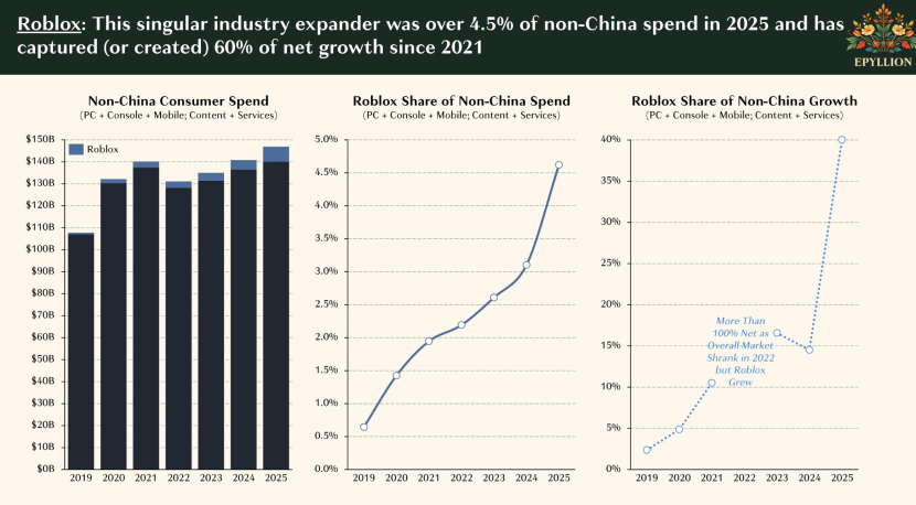在报告的后部分,总结市场结构性增长机会时,Matthew将Roblox单独拎出来做了一个章节。