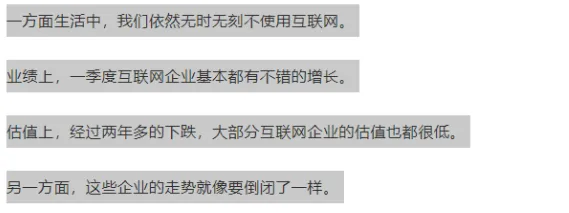 股市跌到2600点的时候,认为股市要没了,互联网跌到极致的时候,虽然上着网,但认为互联网要没了。