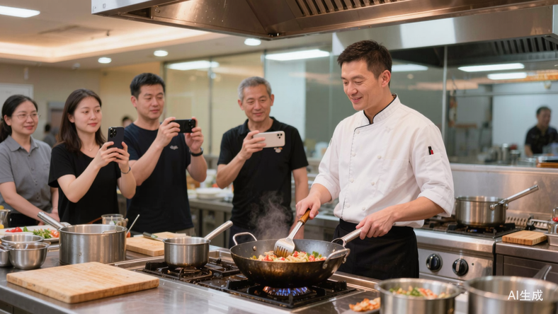 桌边现场制作:将部分制作环节移到餐桌,顾客直接参与或者观看。不一定是整道菜,哪怕只是最后的浇汁、摆盘、点火,都能制造见证感。