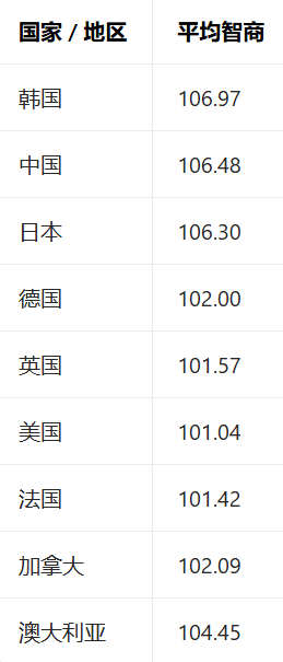 再看看主流机构检验和评估的国民智商水平。