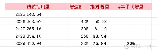 去年碳酸锂针对锂电池这块用量大概是2280*0.063=143.64万吨,作为起点,然后后面4年平均复合增幅30%(传统方向的用量不考虑),见下图: