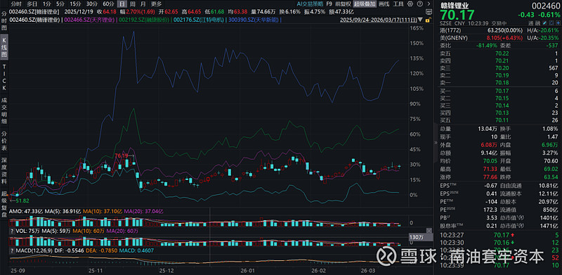 第2个大类是在1月下旬从1月20号到1月29号之间出现股价最高点的公司,包括1月20日最高点的藏格、1月26日最高点的中矿、赣锋H、天齐H、华友,1月29日最高点的紫金A+H、和XZ珠峰。我们也把日K线拉出来看看,当然K线走势上看,有趣的是这几家公司的日K线也呈现了高度的相似性,基本可以说是一个走势,这里面有个异常是天齐H,就是图中那根蓝色的线,从2月份开始就大幅下跌然后跌不动了,从企业公告里面我们看到公司在2月4日公告了出售智利锂矿子公司股权以及增发配售、可转债等多项稀释股东权利募集资金的行为,被市场解读为严重利空,因此走势出现了背离,但是实际在此之前这几家公司的走势可以说是高度一致的。