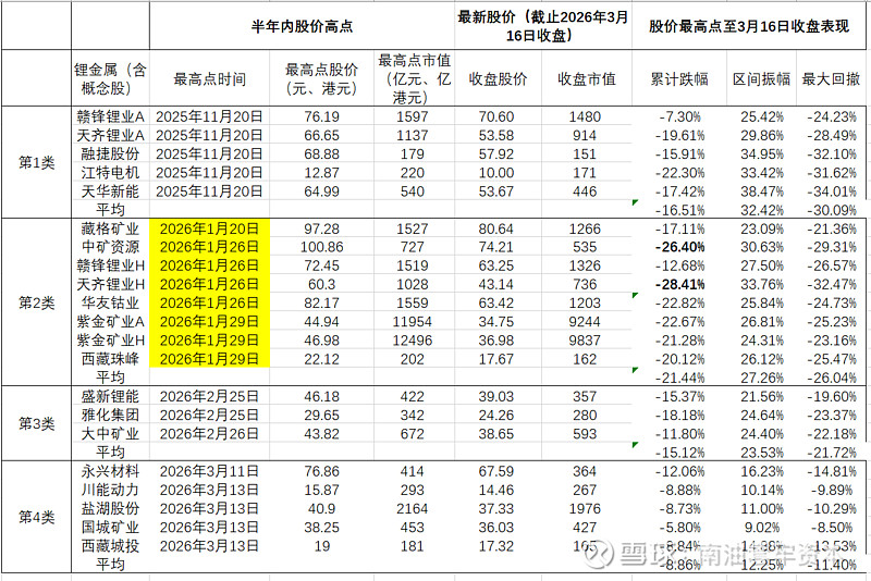 各位锂矿矿工们大家好呀,我从辣鸡南油转战锂矿来了,之前80买了点底仓,目前看暂时套牢了,如果这次又套牢很久我就改名中矿山顶资本。今天来分享一个有意思的发现,最近老看到雪球上有人喷中矿的说津巴布韦的矿要完了,所以中矿股价跌跌不休,然而我认真翻了一下其他的锂矿股,发现也在持续回调,所以我做了个简单的分类,按照最近半年最高点的股价时间,结果有个非常有趣的发现: