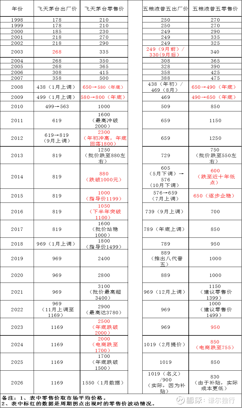因此,我们就来看茅台、五粮液各自核心产品零售价变动与白酒周期的相关性数据(见下表)。