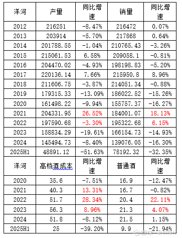 由于洋河一季度业绩占全年销售数据的接近50%,因此通过2025年半年报数据,初步估算出2025年全年销量约100000吨,高端酒成本约30亿元。