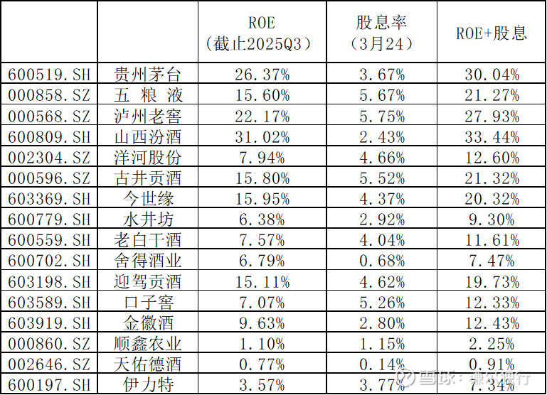 下表是当前上市酒企的ROE+股息率表,大家参考。