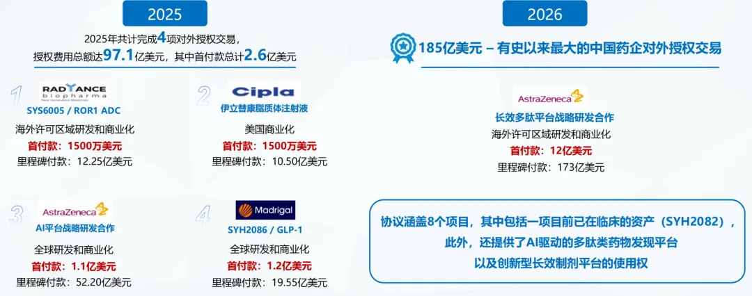如果视线转到Pharma,其实石药在过去一年是资本市场的BD明星,无论是3个50亿美元的BD卫星,还是最后算下来15亿美元收入,200多亿美元总额——石药在BD市场都留下了浓重的一笔。