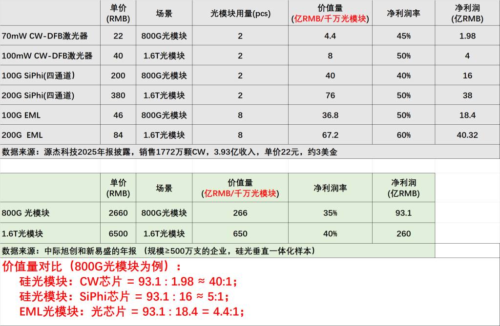 这意味着,即便光芯片净利润率略高,但光模块的整体价值变现能力,是CW芯片的40倍、调制光芯片(EML/SiPhi)的5倍左右。源杰这类光芯片企业估值溢价可以到500PE,市场非常慷慨。但如果忽略IDM光模块企业的价值,本质上是对产业链价值分配的误判。