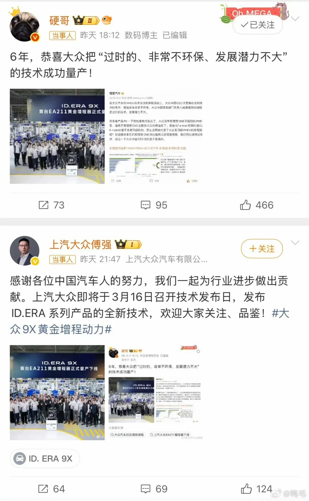 这柄“回旋镖”精准地飞向了六年前。彼时,大众中国CEO冯思翰(Stephan Wöllenstein)曾公开断言,利用汽油发电的增程式电动汽车“非常不环保”,其中国研发负责人威德曼(Thomas Wiedmann)更直指这项技术“已经过时,发展潜力有限”。