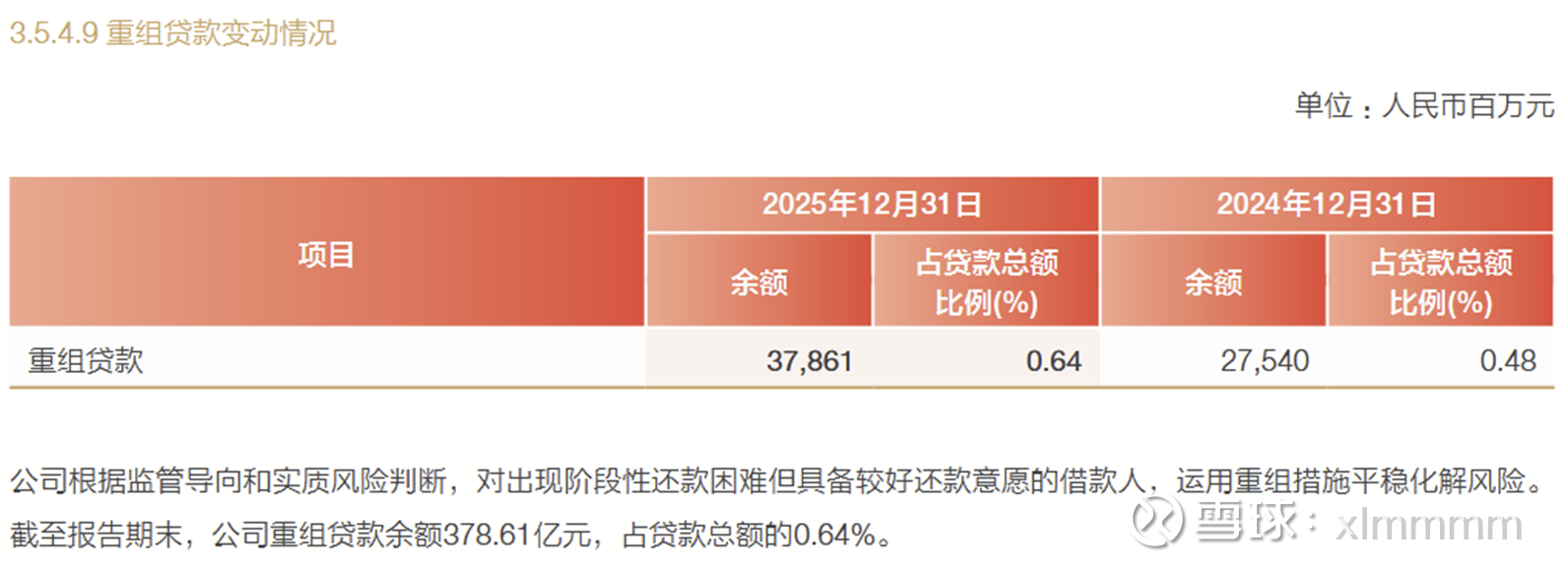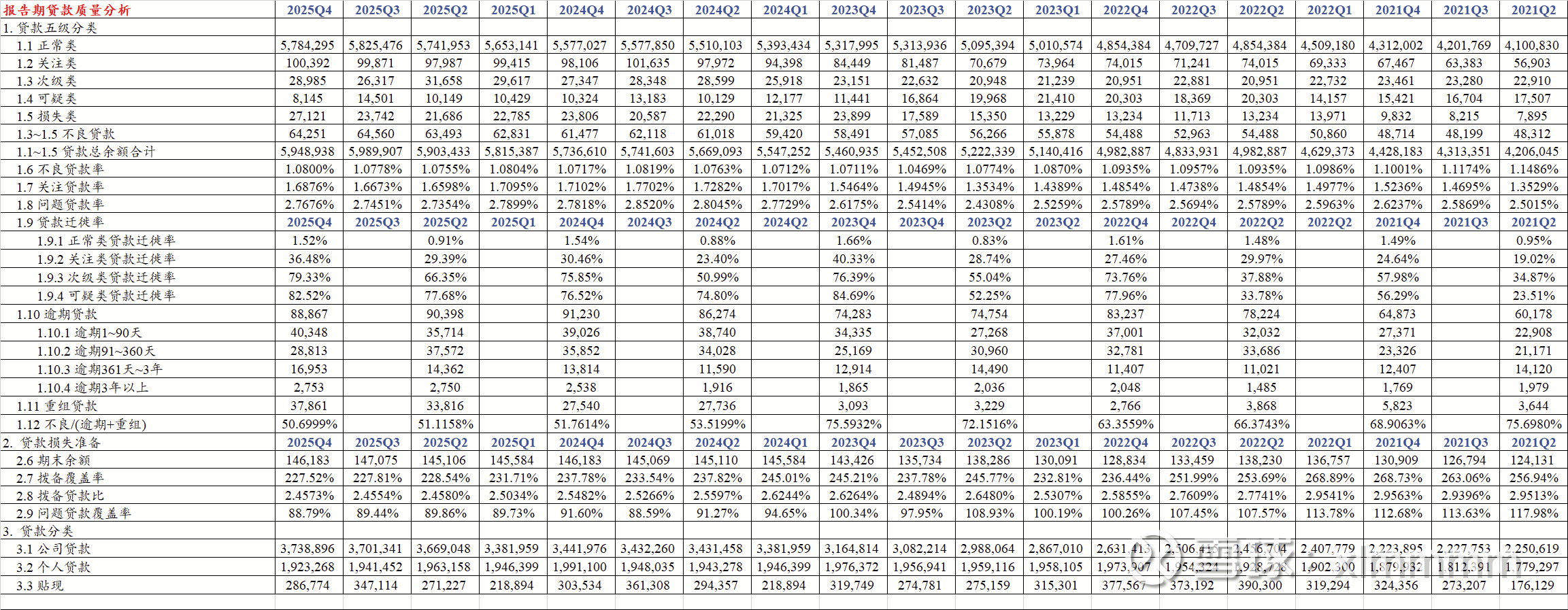 【2】重组贷款的疑问。2025年末重组贷款378.61亿,同比大幅增加103亿,详见下图!实际上根据银监会规定,重组贷款至少应该被划分为关注贷款。那么这个大增的103亿中,到底有多少被划分为关注贷款,多少划分为不良贷款?重组贷款和逾期贷款合计1267亿,而不良贷款余额642.51亿,后者与前者之比越来越低,是不是说不良认定越来越宽松了?关注贷款同比增加22亿,达到1003.92亿的高位,加上642.51亿的不良贷款,问题贷款合计1646亿,拨备池余额1461亿,大概能覆盖了88%的问题贷款。这个数据在上市银行中属于中等水平了,2023年的拨备余额大概还能全面覆盖问题贷款,2024年末能覆盖91.6%,现在已经下降到了88%。下面的表格中,略有好转的数据是正常贷款迁徙率,2023年为1.66%,2024年为1.54%,2025年降低到1.52%。其余数据看下面的表格。