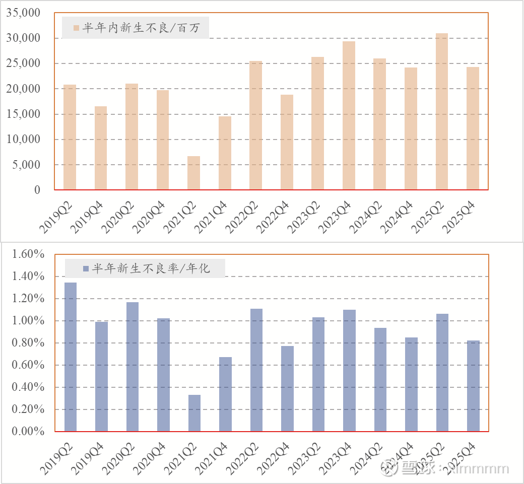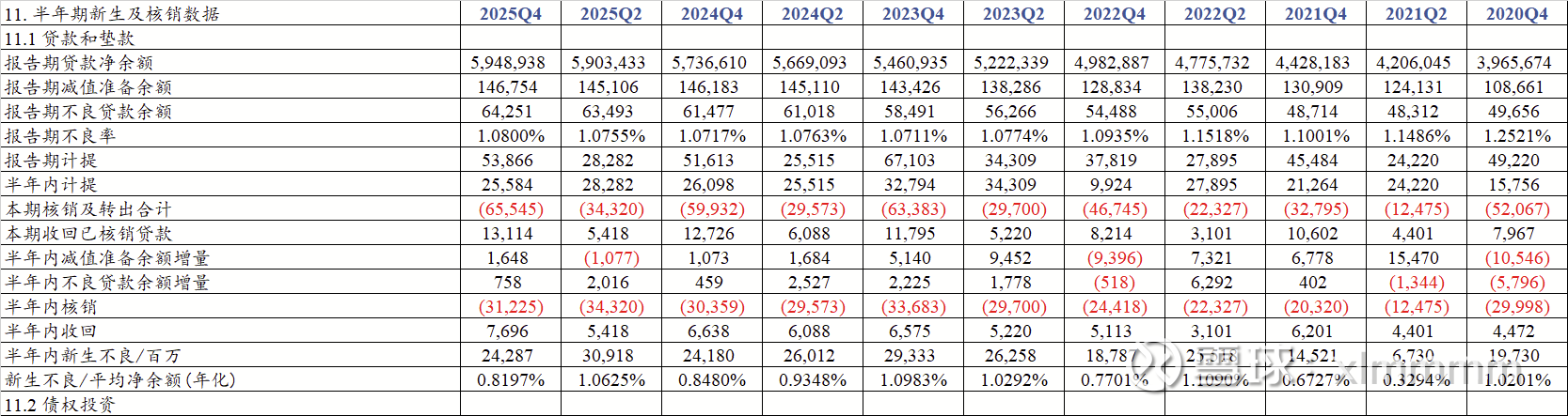 【3】新生成不良贷款率。新生成的不良贷款是我每年关注的数据,但是由于每家银行对于不良认定的严格程度并不相同,甚至同一家银行在不同时期对于不良的认定严格程度也有不同,所以其实这个数据顶多也就是纵向对比下有点用。每半年的新生不良详见下图,具体计算过程详见下表,我就不再赘述。2025年下半年的新生不良率为近三年最低,感觉这个数据还可以。