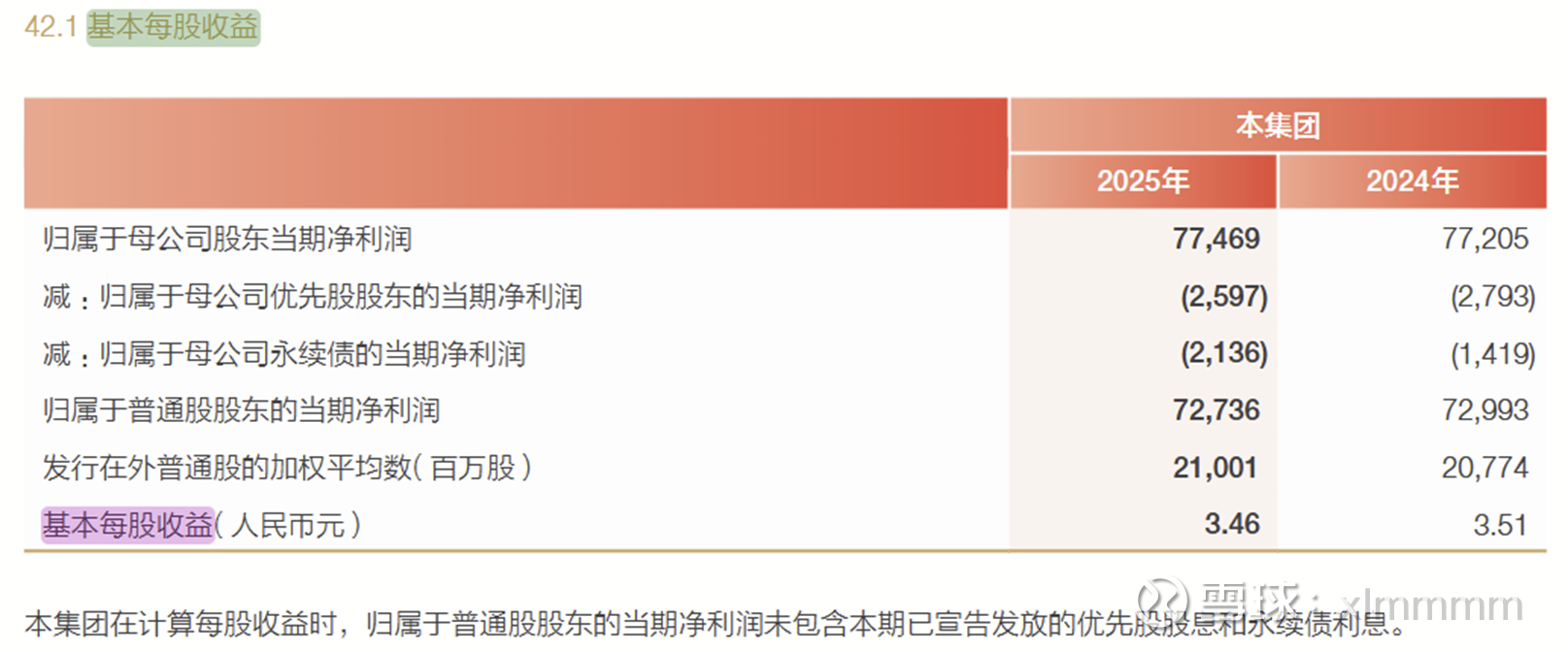 【5】基本每股收益。财报公布的每股基本收益是3.46元,但其实截止2025年底,总股本变成了211.63亿股,而不是表格中的加权股本。按211.63亿股来计算的话,基本每股收益3.437元,而不是3.46元,这个同比2024年的3.5136元,少了7.7分钱。不过对于2026年,由于优先股已经全部赎回,而且800亿永续债的利息也很低,归母利润的分配将比2025年好很多。2025年优先股和永续债利息合计47.33亿,而2026年仅需17.92亿,光这一项就能省下29.41亿,可以为每股基本收益增厚0.139元!这点肯定利好2026年财报。