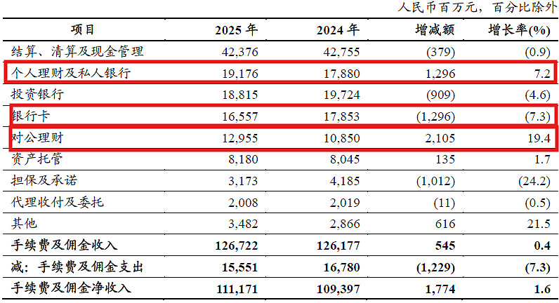 工行的手续费收入在连续2年下降后,2025年也录得了反弹。工行2025年手续费收入明细如下图2所示: