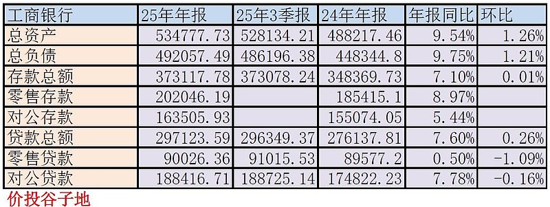 工行年报总资产53.48万亿,同比增长9.54%,年报资产规模首次站上50万亿的整数台阶。其中贷款总额29.71万亿,同比增7.6%。对公贷款增速高于零售贷款。工行年报总负债49.21万亿,同比增长9.75%。其中存款总额37.31万亿,同比增长7.1%。存款增速比2024年有较大改善。更多的数据参考表3: