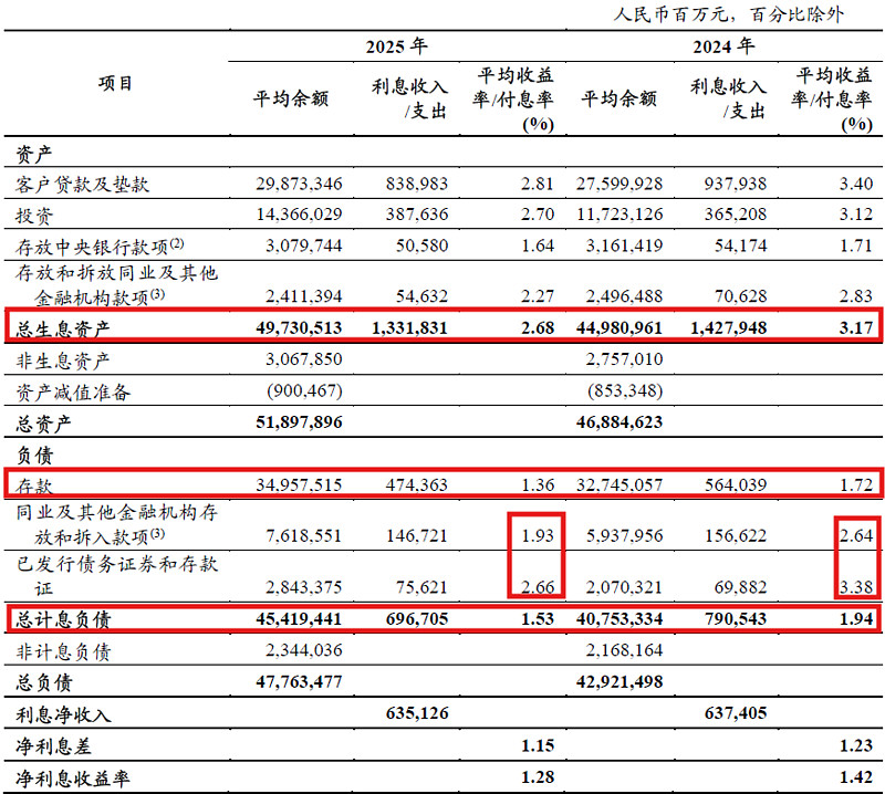 从表3我们看到工行的负债结构相比2024年有明显改善。存款增速较2024年提高不少,特别是对公存款的表现进步显著。2024年工行的对公存款同比负增长,2025年虽然对公存款的增速依然低于零售存款增速。但是差距已经明显收窄,说明工行的存款业务发展更加均衡。