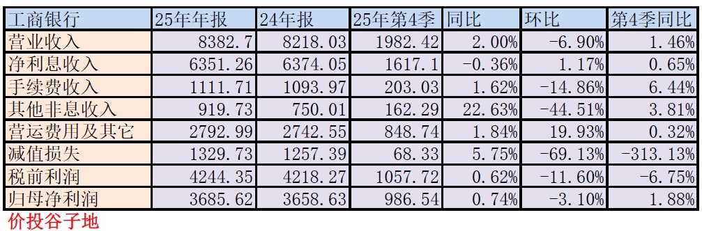 工商银行2025年的年报感觉明显好于2024年,除了净利息收入受外部环境影响微幅下降外,其他各项收入都表现良好。特别是其他非息收入在去年多数同业都负增长的情况下取得正增长22.63%的成绩,表现可圈可点。另外,工行2025年的信用减值计提依旧保持了正增长。这和很多中小银行通过压低减值做高利润增速不同。工行提高信用减值,增加自身应对和处置风险的能力,使得公司的经营更具有长期可持续性。在此基础上收获的净利润同比增长的含金量更高。