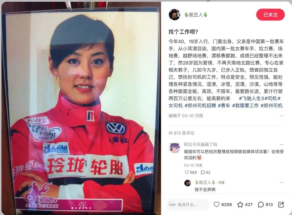 我注意到张诺,是因为她在社交平台上发布的一条求职信息:“职业女赛车手,寻找一份职业司机的工作。”