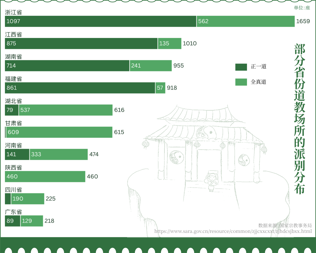 正一道和全真道是道教的主要流派,两派的场所分布呈现出明显的地域差异。正一派主要分布在浙江、江西、福建、湖南等东南地区,全真派主要分布在西部省份,如甘肃、陕西等。