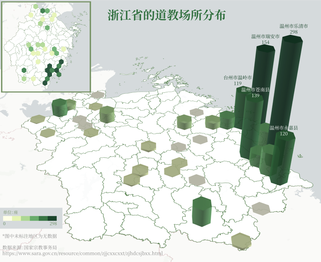 浙江省的道观大多分布于东南沿海一带,温州市和台州市共有1475座道观,约为全省的88%。这不仅与当地的社会历史和经济文化条件相关,自然地理因素也起到了重要作用。