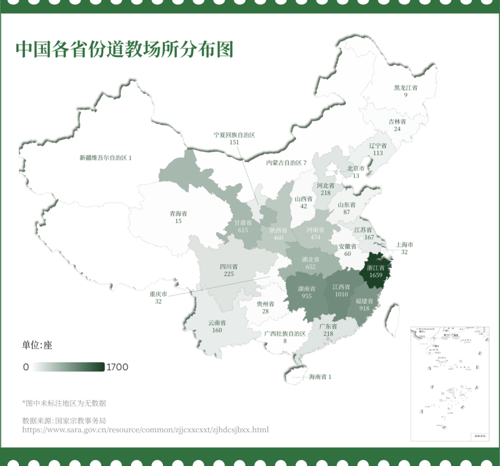 道教场所的分布格局是我国宗教文化地理特征的重要体现。这8349座道观,遍布29个省、自治区和直辖市。其中浙江省的道观数量独占鳌头,全省共有1659座道观,占据全国总数的约五分之一。紧随其后的是江西、湖南、福建、湖北等省份。