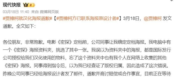 不久前,贾樟柯就刚刚经历了这么一遭,误发了未经授权的海报之后,才匆匆补了授权。