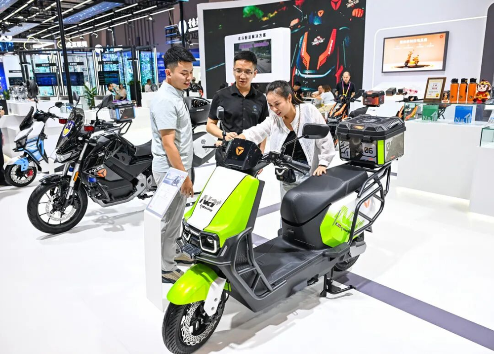 2025年9月5日,观众在重庆智博会现场参观电动摩托车图片来源:新华社