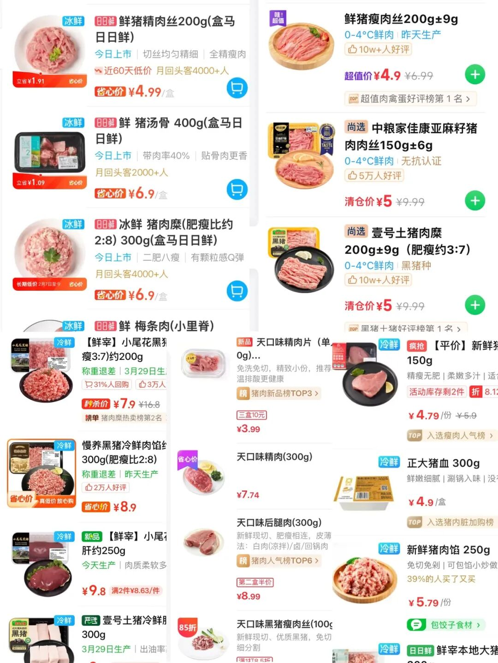 钱大妈、盒马鲜生等连锁商超更是火力全开,3.99元/盒的一人份分装猪肉、9.9元/斤的精品五花肉、19.8元/斤的排骨轮番上线。