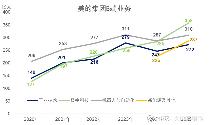 2025年年报,美的集团B端业务的财报信息披露进行了一次比较明显的调整,那就是将新能源板块从“工业技术事业群”拆了出来,这也是美的比之前更重视新能源业务的直观表现。