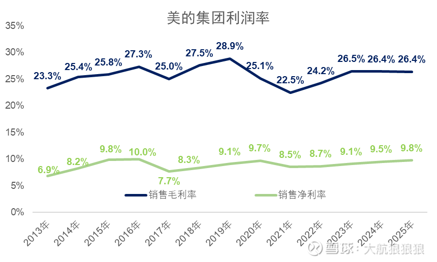 2025年,美的集团的毛利率保持在26.4%的正常水平,净利率相比于2024年继续小幅上升,达到了9.8%的近十年最高点。