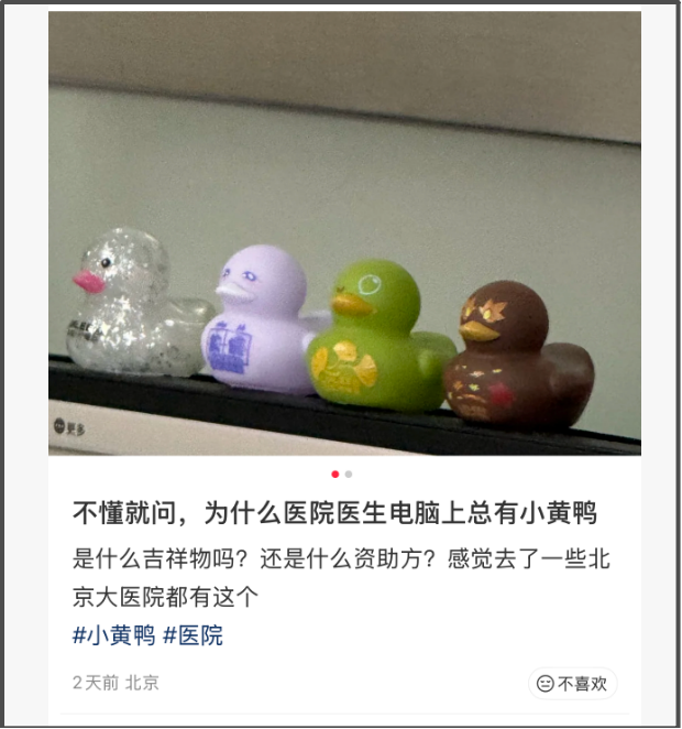 面对幼儿患者时,小黄鸭是当之无愧的社交货币,随手拿出一个鸭子贿赂小孩,就能保证小孩不哭不闹,乖乖配合检查、打针、吃药。