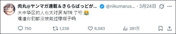 上周,国内NTR圈子里小有名气的漫画家肉丸,在推特吐槽:“为什么中文圈都这么讨厌NTR,你们都没有被绿过吗?”