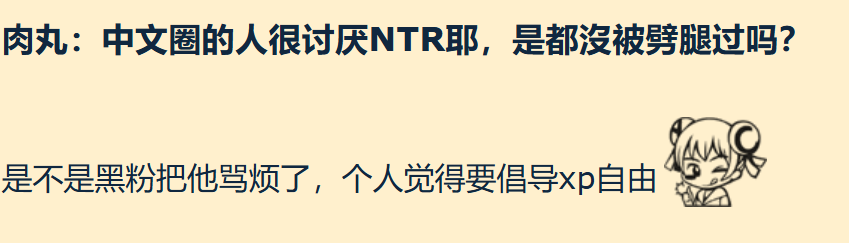 几个社交平台都在传肉丸的这句发言,“原来喜欢NTR是因为被绿过,大家懂的懂的”,各类帖子摞起来估计得有个几十条。虽然算不得什么大新闻,但在NTR这种不怎么见光的圈子里,也算难得一见的乐事。