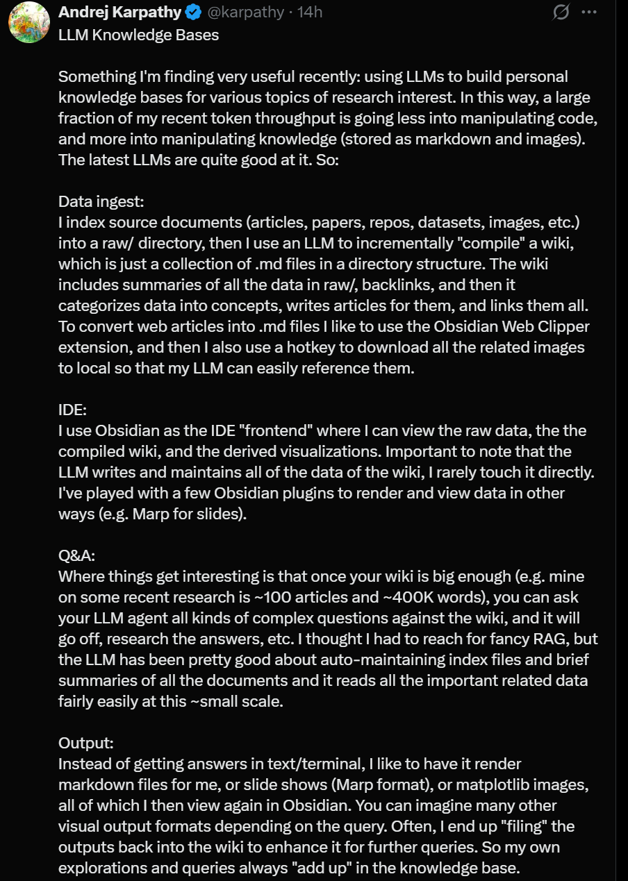 Andrej Karpathy昨天发了条推文,说他现在大部分token消耗不是在写代码,而是在用LLM管理知识。他把原始素材(论文、文章、数据集)扔进一个目录,然后让LLM “编译”成一个wiki——一堆.md文件,有摘要、有分类、有反向链接,全部由LLM维护,人基本不碰。
