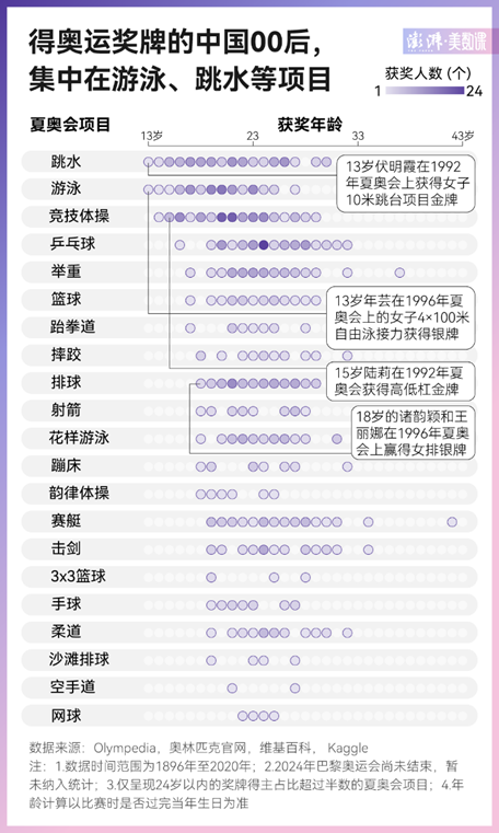 不同项目,发育关的“杀伤力”也不一样。根据澎湃美术课统计的夏季奥运会数据,跳水、游泳、体操等技巧类项目的冠军年龄通常偏小。