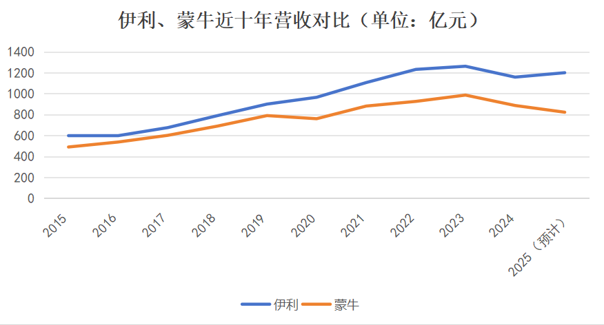 与之相映衬的是,老对手伊利的营收从2020年的965亿元扩大到了2024年的1158亿元(2025年财报还未出),2025年上半年为619亿元,预计全年能破1200亿元。