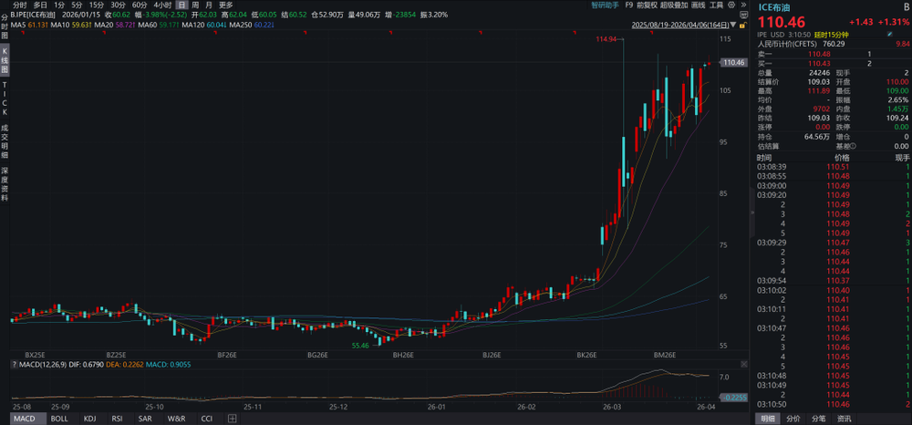 美以伊冲突进入第35天,国际原油价格维持高位,如下图所示,布油价格已经站上了110美元/桶的关口。