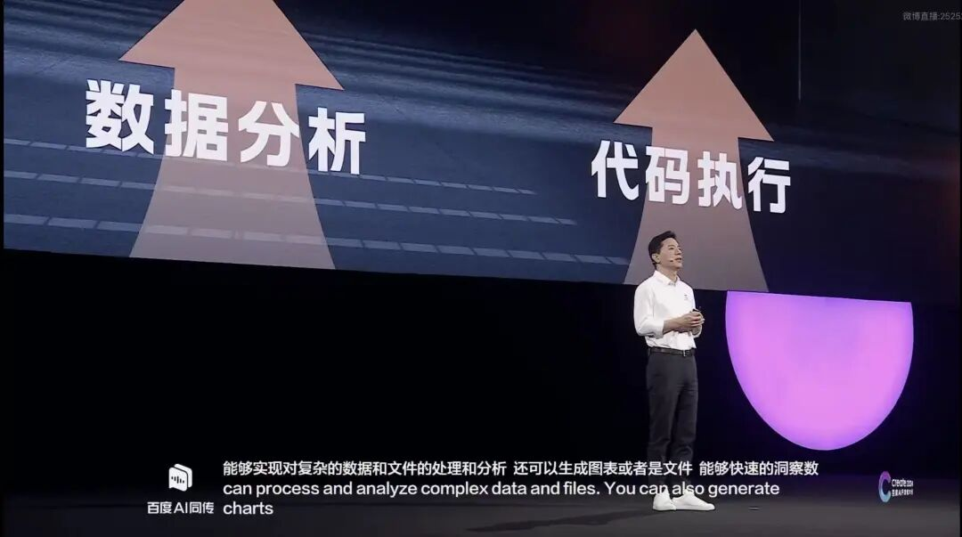 台上,李彦宏西装笔挺地站在舞台中央演讲,畅想着AI行业的未来发展。