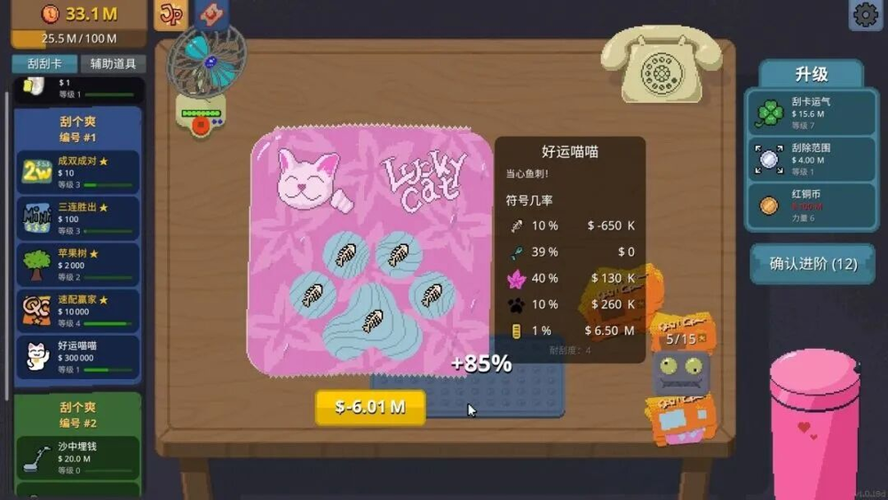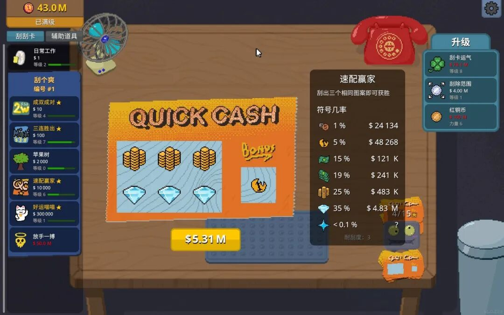 升级运气能够直观地增加中奖率,增加范围和力量可以更快刮完一张奖票,赚钱效率大幅提升。解锁和升级刮奖机、吹风机,更是可以解放玩家双手,自动赚钱。