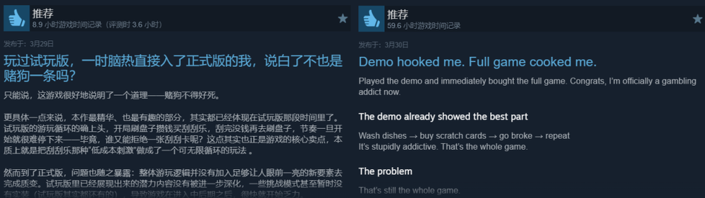 游戏的评论区也很有意思,高赞评论大都一边夸Demo有趣并因此入坑,一边吐槽正式版不好玩,同时还不妨碍玩家们给出93%的好评率。