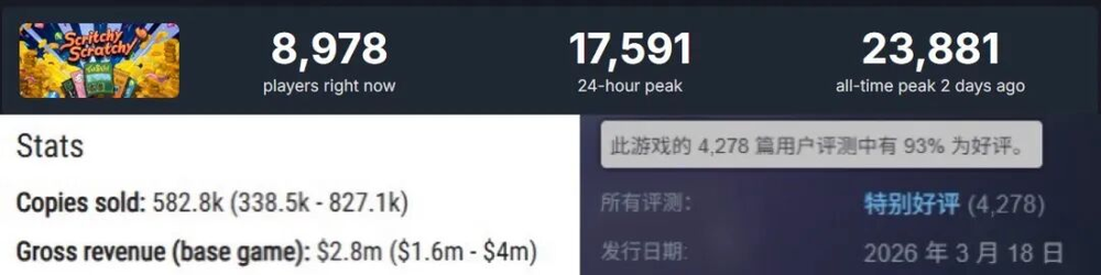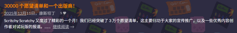 团队制作的《刮个爽》,原本是独立游戏平台itch.io的参赛作品,因为人气不错,在去年8月初转正。后来在12月,游戏Steam愿望单达到30000,同时被丹麦老牌独游厂商Funday Games看重并负责发行。