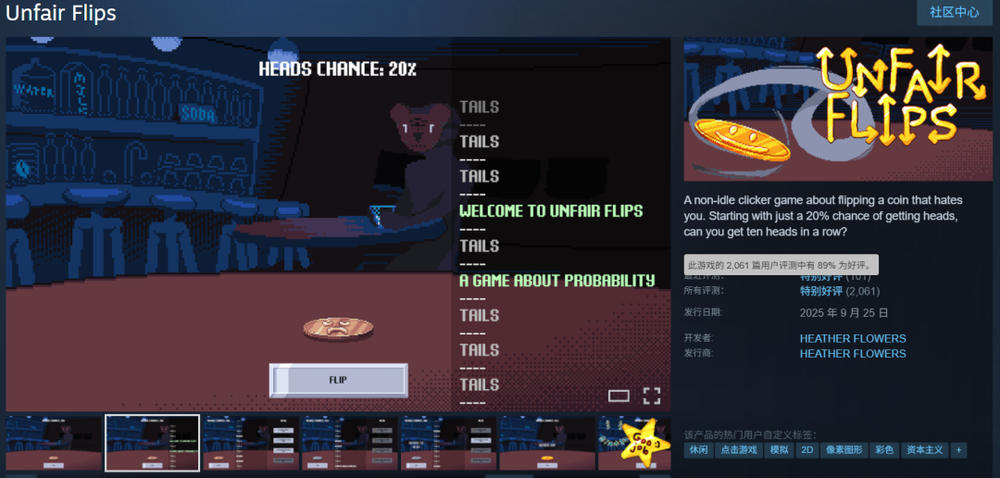 和《幸运房东》差不多,《四叶草深渊》把增量机制打散,然后与肉鸽体系糅合到了一起,不算纯增量游戏。而如《不公平的抛硬币》的产品,走的则是纯增量路线。