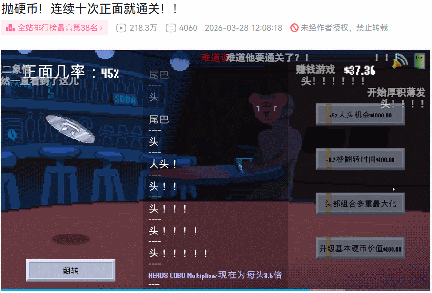 纯数学角度,这个目标几乎无法达成,但游戏里可以抛硬币赚钱,再慢慢升级概率和效率。于是,偶尔运气爆棚的连续正面,配合游戏里时不时的骚话,节目效果就有了。