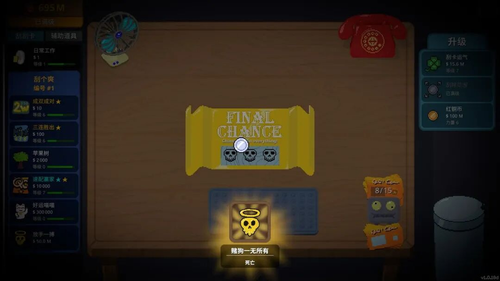 在这之后游戏画风一转,解锁“放手一搏”的刮刮乐,初玩《刮个爽》的人很容易因为惯性思维,直接攒5000万买这张刮刮乐,结果只会刮出三个骷髅头,并且结束游戏。结合成就里“赌狗一无所有”的评语,莫名嘲讽。