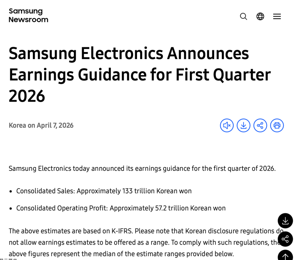 今天,三星电子公布了2026年一季度业绩预告,交出了一份刷新历史的炸裂成绩单:单季营收133万亿韩元(约合881亿美元),利润57.2万亿韩元(约合379亿美元)。