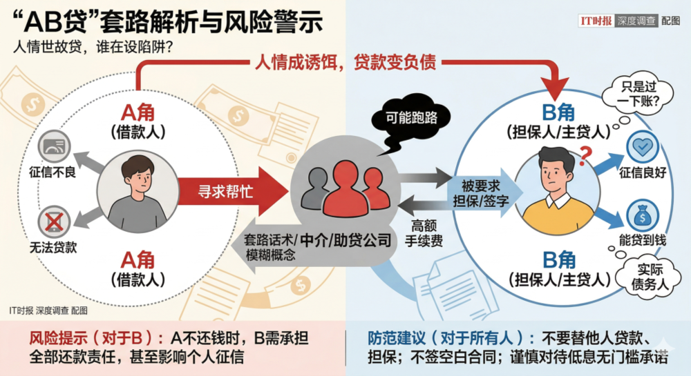 《IT时报》记者注意到,2026年1月,河南平顶山市公安局的官网发布了该公安局破获一起特大“AB贷”合同诈骗案的详细过程:李某(B角)和张某(A角)在某助贷公司处贷了24万元,除了签署《贷款居间服务合同》外,还有一份“补充协议”,承诺六个月后保证把贷款转到张某名下。但等到银行催收还款时,这份协议却成了推卸责任的工具:“这是你们之间的借贷纠纷。”