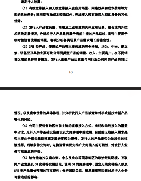 除了在撒哈拉以南的非洲地区面临风险,通则康威在其他市场销售或也面临“光纤替代FWA”的挑战。在第二轮问询中,深交所进一步就其“产品替代风险及市场成长空间”问题进行发问;